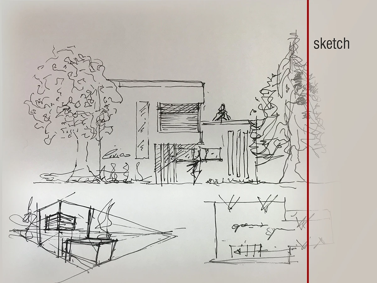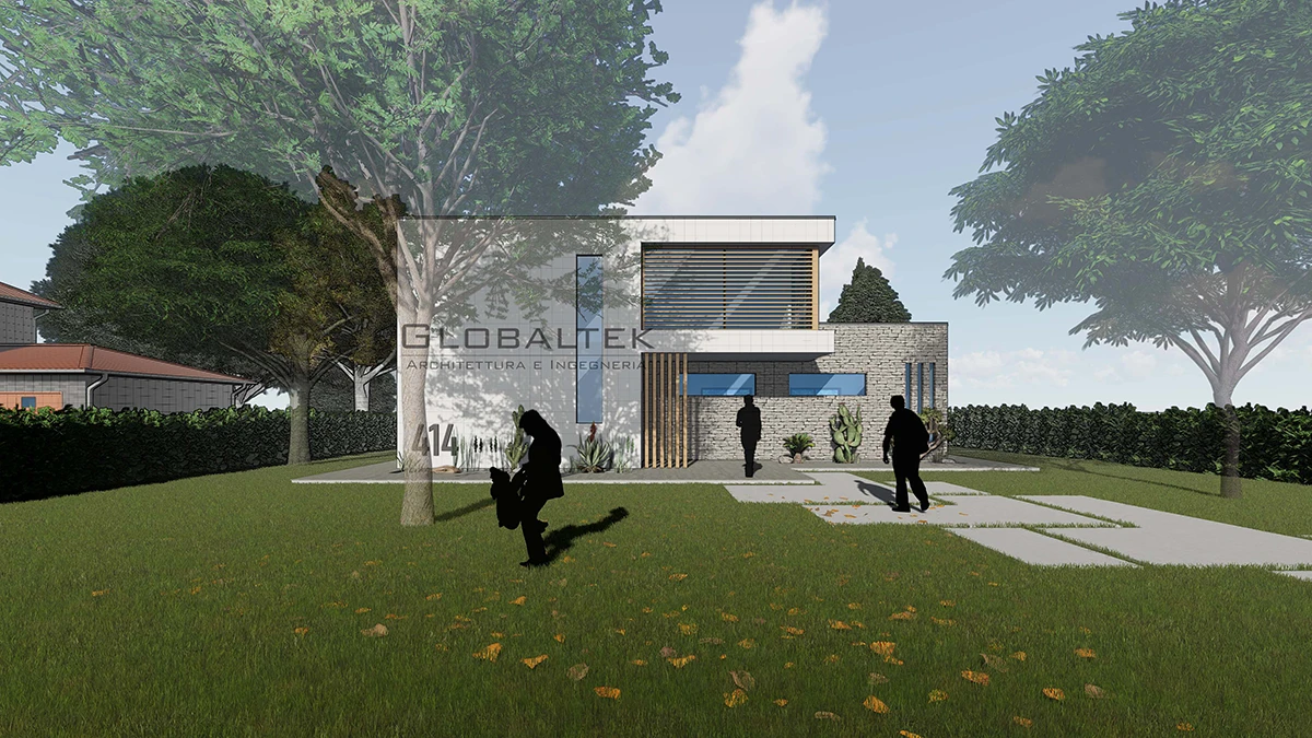 L’edificio nasce dall’intersezione di due volumi rettangolari e dalla loro scomposizione su due livelli.